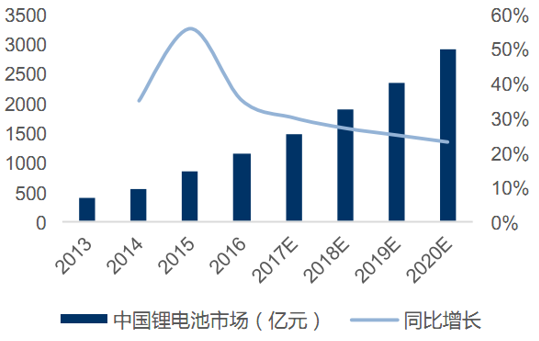 我國(guó)鋰離子電池市場(chǎng)規(guī)模估算(億元)