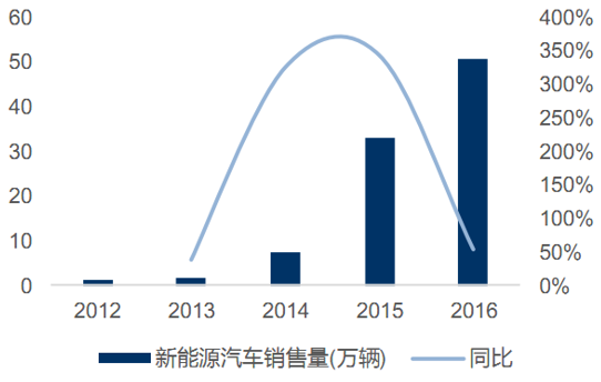 我國(guó)新能源汽車(chē)成爆發(fā)式發(fā)展。2014-2015年受政策驅(qū)動(dòng),新能源汽車(chē)概念在市場(chǎng)上迅速推廣,我國(guó)新能源汽車(chē)銷(xiāo)售量的增長(zhǎng)率均超過(guò)300%;2016年銷(xiāo)售量達(dá)51萬(wàn)輛,同比增長(zhǎng)率也高達(dá)53%。根據(jù)工信部規(guī)劃的2020年我國(guó)新能源年銷(xiāo)量目標(biāo)(200萬(wàn)輛)估算,2016-2020年復(fù)合增長(zhǎng)率將在40%左右,維持高速增長(zhǎng)趨勢(shì)。