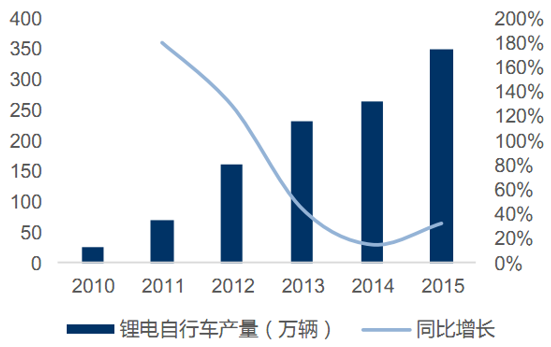鋰電自行車(chē)快速增長(zhǎng)推動(dòng)動(dòng)力電池需求上升。除汽車(chē)以外,我國(guó)鋰電自行車(chē)產(chǎn)量也在迅速提升,2015年鋰電自行車(chē)產(chǎn)量達(dá)350萬(wàn)輛,同比增長(zhǎng)32%,2010-2015五年復(fù)合增長(zhǎng)率高達(dá)70%。電動(dòng)汽車(chē)、鋰電自行車(chē)需求的迅速上升,使得動(dòng)力鋰離子電池需求量大幅上升,使之成為帶動(dòng)鋰離子電池行業(yè)增長(zhǎng)的主力。