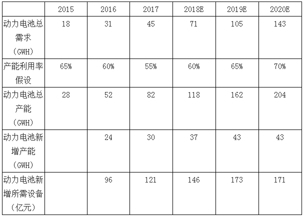 我國(guó)鋰電設(shè)備市場(chǎng)空間2020年預(yù)計(jì)到210億。根據(jù)中國(guó)預(yù)測(cè),假設(shè)動(dòng)力鋰離子電池實(shí)際產(chǎn)能利用率為55-70%,消費(fèi)和儲(chǔ)能鋰電產(chǎn)能利用率90%,到2020年我國(guó)鋰離子電池產(chǎn)能預(yù)計(jì)將超過(guò)270GWh。我們假設(shè)每GWh的動(dòng)力鋰電池產(chǎn)能對(duì)應(yīng)的總投資約6億元,其中設(shè)備投資占比65%,而國(guó)產(chǎn)設(shè)備占比到2020年有望提升到100%,則每GWh產(chǎn)能釋放對(duì)應(yīng)的國(guó)產(chǎn)設(shè)備投資約3.9億元,預(yù)計(jì)2020年我國(guó)鋰電設(shè)備規(guī)模約210億元,2016-2020年復(fù)合增長(zhǎng)率約17%。
