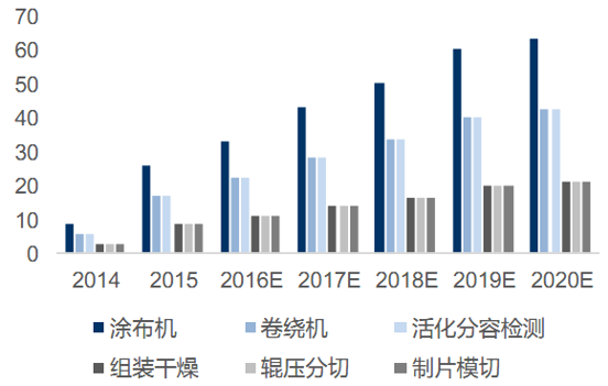 涂布機(jī)、卷繞機(jī)、檢測(cè)設(shè)備產(chǎn)值占比最高。根據(jù)高工鋰電披露的鋰電設(shè)備成本占比分布,屬于前端設(shè)備的涂布機(jī)占比約30%,卷繞機(jī)占比約20%,后端的活化分容檢測(cè)設(shè)備占比約20%,組裝干燥相關(guān)設(shè)備(包括攪拌機(jī))占比10%。結(jié)合該產(chǎn)值比例和預(yù)測(cè)的鋰電設(shè)備市場(chǎng)規(guī)模,計(jì)算出各設(shè)備市場(chǎng)規(guī)模2016-2020年的預(yù)測(cè)值。涂布機(jī)、卷繞機(jī)和活化分容檢測(cè)設(shè)備市場(chǎng)規(guī)模最大,2016年分別在30億元、20億元、20億元左右,2020年預(yù)計(jì)將超過(guò)60億元、40億元、40億元。