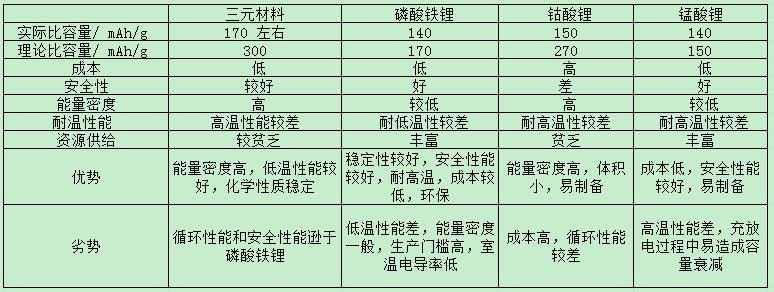 對(duì)比四種材料可以看出,三元材料、鈷酸鋰的理論比容量較高,磷酸鐵鋰、錳酸鋰的理論比容量和成本都比較低,鈷酸鋰在車用電池使用方面應(yīng)用成本較高,因此受下游市場以及自身生產(chǎn)狀況等因素影響,目前車用市場還是以磷酸鐵鋰和三元材料為主。