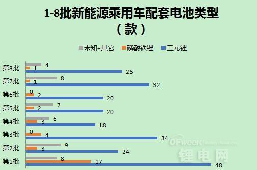 2017年工信部公布的8批共296款新能源乘用車中,采用最多的是三元鋰,共有221款,磷酸鐵鋰的有33款,未知及其他的有42款。各批次新能源乘用車配套電池具體情況如下: