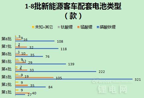 2017年1-8批新能源客車共1526款,其中配套電池最多是磷酸鐵鋰,有1095款,其次是錳酸鋰有325款、鈦酸鋰有57款、其他的有49款。各批次新能源客車配套電池具體情況如下: