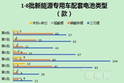 2017年工信部公布的8批共716款新能源專用車中,采用最多的是三元鋰,共有467款,磷酸鐵鋰的有188款,錳酸鋰的有26款,未知及其他的有35款。各批次新能源專用車配套電池具體情況如下: