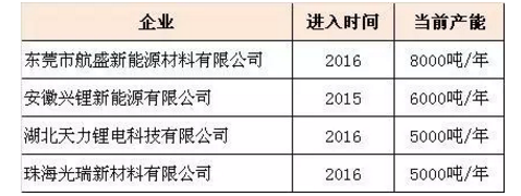 盡管如此,穩(wěn)定的利潤空間、鋰電池耗材屬性等兩大特點還是吸引著不少新進入者。從2015年后進入的企業(yè)來看,這些企業(yè)具備鮮明特征:比如瞄準數(shù)碼鋰電池低端市場,但囿于掌控六氟磷酸鋰等原材料能力弱及產能小等原因,布局動力市場者進展緩慢。