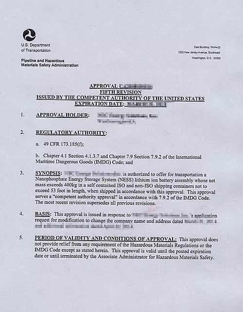 目前在美國(guó)運(yùn)輸此類產(chǎn)品之前,都必須獲得美國(guó)交通部(DOT)PHMSA的特別批準(zhǔn)文件后才能進(jìn)行公路、鐵路、海洋運(yùn)輸。然而能夠通過并且獲得DOT的審批,需要提交復(fù)雜的文件和漫長(zhǎng)的等待,而最終獲得過特別批準(zhǔn)的也僅為極少數(shù)的美國(guó)知名制造商。