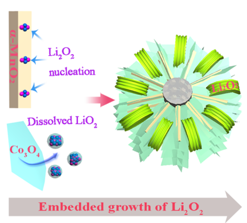 中國(guó)儲(chǔ)能網(wǎng)訊:鋰空氣電池因具有超高的理論能量密度而被認(rèn)為是電動(dòng)汽車的潛在動(dòng)力電源。鋰氧電池的放電產(chǎn)物過(guò)氧化鋰(Li2O2)具有絕緣、不溶的特性,因此,隨著放電的進(jìn)行,電極表面會(huì)逐漸被其鈍化而導(dǎo)致放電終止。大尺寸Li2O2的生成有助于延緩正極表面的鈍化、延長(zhǎng)放電時(shí)間、提高電池容量。然而,大尺寸Li2O2在電極表面往往隨機(jī)散落,難以保證其與電極材料之間的有效接觸,從而限制了電池的倍率性能和能量效率。因此,亟需實(shí)現(xiàn)大尺寸Li2O2在電極材料中的嵌入式生長(zhǎng)。