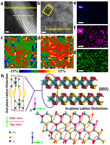 溫兆銀團(tuán)隊(duì)在前期成功合成定向結(jié)構(gòu)三維二硫化鉬材料的基礎(chǔ)上(ACS Nano, 2015, 9 (12), 12464-12472. DOI:10.1021/acsnano.5b05891),采用低溫液相法成功地設(shè)計(jì)了層內(nèi)二硫化鉬/二硒化鉬異質(zhì)結(jié)構(gòu),通過(guò)與美國(guó)伊利諾伊斯大學(xué)合作進(jìn)行的球差校正掃描透射電鏡分析證明了該層狀材料層間和層內(nèi)高度的晶格畸變,且沿相同晶面呈現(xiàn)間距不規(guī)則的特性,這種高度畸變的亞穩(wěn)結(jié)構(gòu)能夠顯著提升材料的催化活性。原位透射電鏡揭示了鋰離子在材料結(jié)構(gòu)中的快速穿梭和傳輸。此種高活性的催化劑首次成功地實(shí)現(xiàn)了金屬硫化物在鋰空氣電池中的穩(wěn)定深度循環(huán),具有潛在的應(yīng)用價(jià)值。
