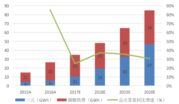 未來動力電池出貨情況進行了預(yù)測,由于其他動力電池占比較小,僅以磷酸鐵鋰和三元兩種動力電池進行預(yù)測。預(yù)計未來動力電池總出貨量將以年復(fù)合增速 35.79% 的速度增長,到 2020 年,出貨量將達 85GWh 。其中三元電池占比逐年提高,2019 年將與磷酸鐵鋰電池各占半壁江山,并于2020 年市場份額達到55% ,現(xiàn)出貨量實現(xiàn)47GWh。