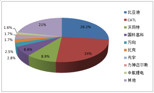 動力電池生產(chǎn)企業(yè)中,比亞迪與 CATL2016 年分別出貨 7.35GWh和 6.72GWh ,合到計市場份額達到 50.2% ,沃瑪特與國軒高科市場占有率也分別為8.9%和 和 6.6%余企業(yè)2016 年動力電池出貨量均小于1Gh,前10 名企業(yè)合計市場占有率達79% ,市場集中度較高。