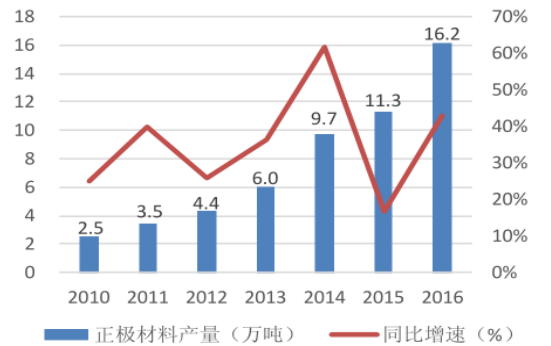 受動力電池市場持續(xù)增長影響,2016年我國鋰電池正極材料產(chǎn)量16.16萬噸長,同比增長 43% ,其中,磷酸鐵鋰正極材料產(chǎn)量5.7 萬噸,同比增長 75% ;三元正極材料產(chǎn)量5.43 萬噸,同比增長 49% ,兩者增長主要由動力電池需求拉動,鈷酸鋰產(chǎn)量 3.49 萬噸,同比增長 9.4%,主要受 3C 消費電子產(chǎn)品拉動。