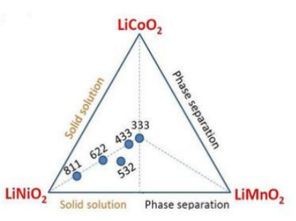 根據(jù)所含金屬離子種類的不同,三元正極材料又可進一步分為鎳鈷錳酸鋰三元材料(NCM)和鎳鈷鋁酸鋰三元材料(NCA)兩種。由于鎳有提高材料能量密度的作用, NCM 材料根據(jù)三種過渡金屬離子占比的不同,又可進一步分為低鎳的 NCM424、NCM333、NCM523 以及高鎳的 NCM622、NCM811等材料。NCA 中由于鋁元素含量較少,主要為鎳、鈷兩種元素,因此也為高鎳三元材料的一種。目前國內(nèi)動力電池均為NCM體系,產(chǎn)業(yè)化進程主要是從低鎳的 NCM333、523 等向高鎳的 622、811 方向發(fā)展,國外與國內(nèi)進程類似,但在 622 向 811 發(fā)展階段之間有 701515 過渡。