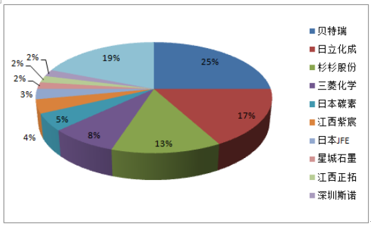 目前,全球負(fù)極市場基本呈現(xiàn)中日兩極爭霸格局,前四名企業(yè)中日各有兩家,合計市場占有率達 63%。 國內(nèi)市場來看,貝特瑞、杉杉股份和江西紫宸占據(jù)前三位臵,三者市場占有率超過 55%,但受動力電池需求拉動人造石墨市場影響,三者的占比差距已進一步縮小。