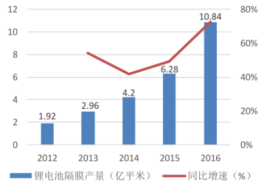 2016 年我國鋰電隔膜產(chǎn)量超過10.84 億平米長,同比增長72.6% 。其中,干法隔膜出貨 6.23 億平米,同比增長 58.5% ;濕法隔膜出貨 4.61 億平米,同比增長96.2%。 。2014 年起,濕法隔膜產(chǎn)量總量比重已達 42.5% ,超過干法單拉隔膜產(chǎn)量。從產(chǎn)值來看,2016 年鋰電隔膜實現(xiàn)產(chǎn)值 42.5 億元,同比增長接近一倍,近年來首次超過產(chǎn)量增速,分析主要由于前幾年隔膜產(chǎn)能過剩,價格不斷下跌,而今年濕法隔膜進口替代已初見成效,隔膜總國產(chǎn)化率從2014 年的 65%上升到 2016 年的 85%所致。