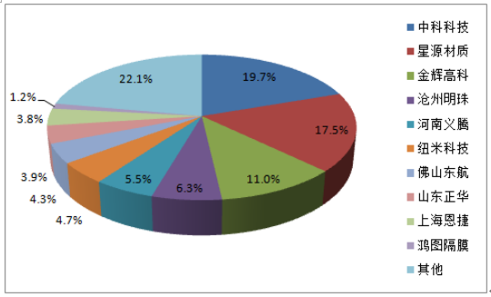 全球來看,鋰電隔膜市場集中度很高,前四大公司市場占有率合計超過 70%,且高端產(chǎn)品其市場占有率更高。我國生產(chǎn)企業(yè)緊隨其后,目前已形成 以星源材質(zhì)為代表的干法單拉隔膜,以中科科技為代表的干法雙拉隔膜和以金輝高科為代表的濕法隔膜三大制備技術(shù)體系,目前三家企業(yè)在國內(nèi)市場占有率合計為 48.2%,市場集中度有進一步提升的空間。