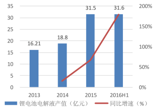 2016 年上半年我國鋰電池電解液出貨 3.97 萬噸,同比增長 65.4%。電解液產(chǎn)值31.6億元,同比增長180%,增速明顯大于出貨量增速,分析主要由于原材料六氟磷酸鋰價格同比增長近 3 倍所致。2016 年全年全國電解液產(chǎn)量達 8.84 萬噸,產(chǎn)值達 59.9 億元。