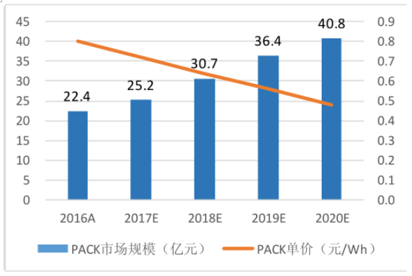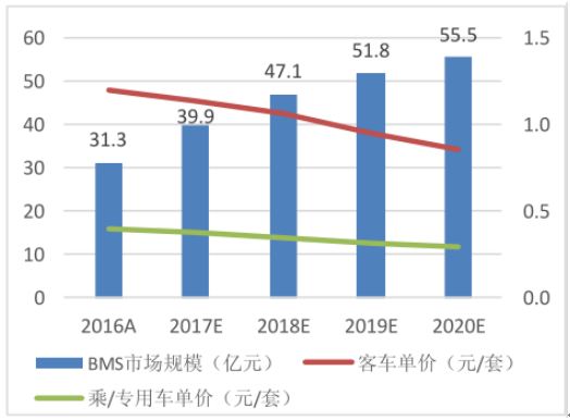客車由于單體電池容量大,電壓等級高,因而BMS 成本較高,目前價格在 1.2 萬元/套左右,乘用車電壓等級較低,成本較低,價格大約在 3000-5000 元/套左右,專用車與乘用車成本基本相同。目前三元電芯和磷酸鐵鋰電芯單價大約分別為 1.2 元/Wh和 1 元/Wh 左右,PACK 后價格大約在 1.8-2 元/Wh 左右,估計 PACK 環(huán)節(jié)目前價格 0.8 元/Wh,以此為基礎(chǔ)對新能源汽車 BMS 及鋰電 PACK 市場規(guī)模進行預(yù)測, 預(yù)計到 2020 年,BMS 市場規(guī)模將達 55.47億元電,鋰電PACK 市場規(guī)模將達 40.8 億元,年復(fù)合增速分別為15.4%和16.2%。