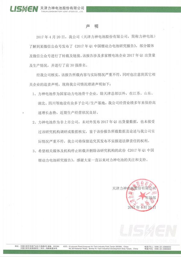 2017年4月20日,我公司(天津力神電池股份有限公司,簡(jiǎn)稱力神電池)了解到某微信公眾號(hào)發(fā)布了《2017年Q1中國(guó)鋰動(dòng)力電池研究報(bào)告》,部分媒體及微信公眾號(hào)進(jìn)行了轉(zhuǎn)載及鏈接。該報(bào)告涉及多家鋰電池企業(yè)2017年Q1出貨量及生產(chǎn)情況,并進(jìn)行了前30強(qiáng)排名。