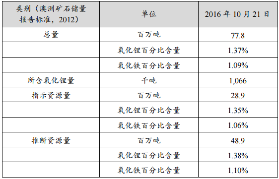 根據(jù) RIM 公司對(duì) Mt Marion 鋰礦項(xiàng)目進(jìn)行加密和擴(kuò)展鉆探勘探工作的研究結(jié)果更新說明,Snowden Mining Industry Consultants 對(duì)Mt Marion 鋰輝石礦項(xiàng)目截至 2016 年 10 月 21 日的礦產(chǎn)資源修訂評(píng)估估算如下: