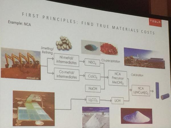 在這種思維模式的指導(dǎo)下,如下圖所示,特斯拉超級(jí)電池工廠對(duì)電池的原材料也有深入的布局。如Kelty所說,這是新型電池能量密度最高同時(shí)成本最低的根本原因。