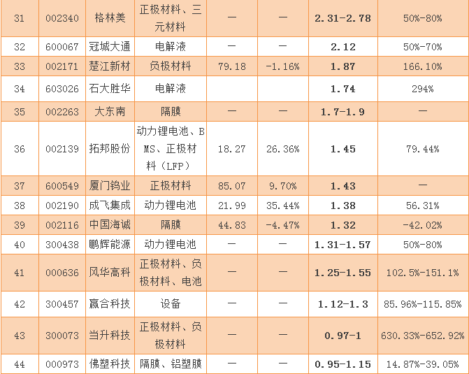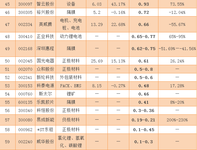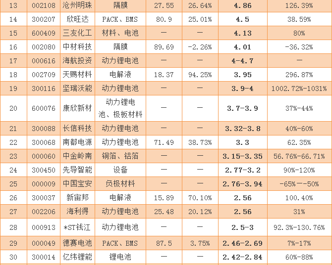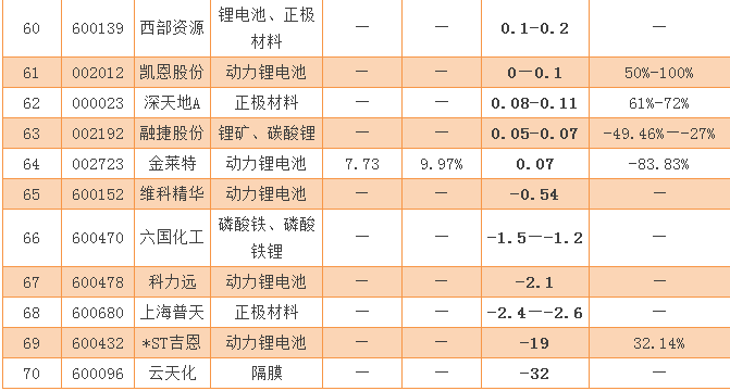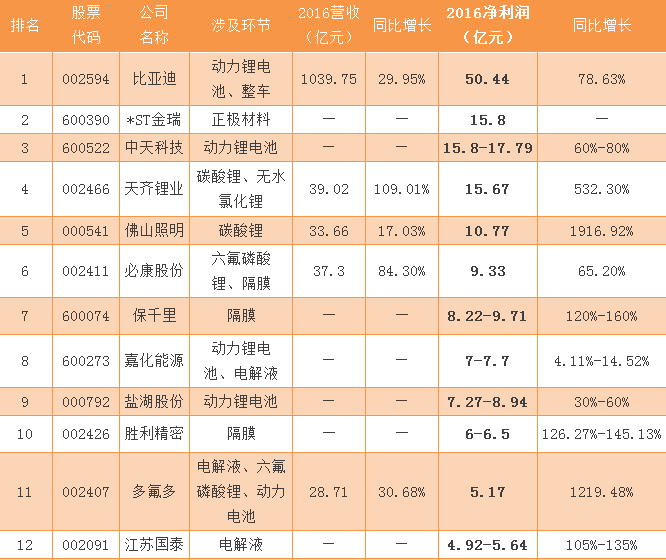 在70家已發(fā)布業(yè)績(jī)預(yù)告的企業(yè)中,凈利潤(rùn)排名前10的鋰電上市公司分別是比亞迪、*ST金瑞、中天科技、天齊鋰業(yè)、佛山照明、必康股份、保千里、嘉化能源、鹽湖股份、勝利精密。