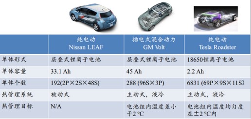 以三款經(jīng)典的電動汽車日產(chǎn)LEAF、雷諾和特斯拉為例,三家汽車廠商基于產(chǎn)品的定位、電池技術(shù)掌握程度等多方面的因素,選擇的電池種類、容量、個數(shù)和熱管理系統(tǒng)就大相徑庭(詳情參見下圖)。特斯拉的優(yōu)勢在于電池管理系統(tǒng),短板在于單體電池領(lǐng)域的積累不足,因而選擇直接從松下購買技術(shù)成熟度高、一致性好的18650型電池;而日產(chǎn)從材料解析到單體電池設(shè)計再到模組管理都有豐富的經(jīng)驗,因而選擇容量較大的層疊式鋰離子電池。