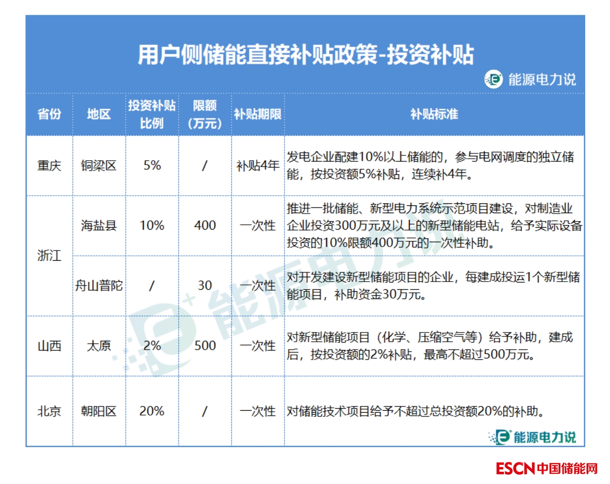 在投資補貼方面,重慶、浙江、山西、北京等多省地區(qū)出臺了儲能投資補貼政策,投資補貼比例在2%-20%之間,單個項目補貼限額在30-500萬元之間,補貼期限多為一次性補貼。其中浙江海鹽縣在《海鹽縣貫徹<浙江省推動經(jīng)濟高質(zhì)量發(fā)展若干政策>承接落實方案(征求意見稿)》提出,對對制造業(yè)企業(yè)投資300萬元及以上的新型儲能電站,給予實際設備投資的10%限額400萬元的一次性補助;重慶t銅梁區(qū)對參與電網(wǎng)調(diào)度的獨立儲能,按投資額5%補貼,連續(xù)補4年。