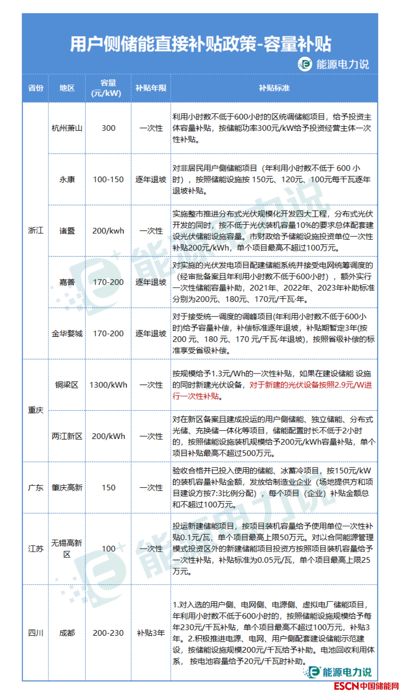 在容量補貼方面,浙江、重慶、廣東、江蘇、四川等多省地區(qū)出臺了儲能容量直接補貼政策,整體補貼標準在100-300元/kW之間,補貼年限方面包括一次性補貼,三年逐年退坡補貼。其中重慶銅梁區(qū)補貼力度較大,在《關于開展2022年銅梁區(qū)光儲一體化示范項目申報工作的通知(征求意見稿)》中明確儲能設施給予1300元/kWh的一次性補貼;浙江永康、嘉善、金華婺城采用逐年退坡補貼方式,補貼標準在100-400元/kW/年。