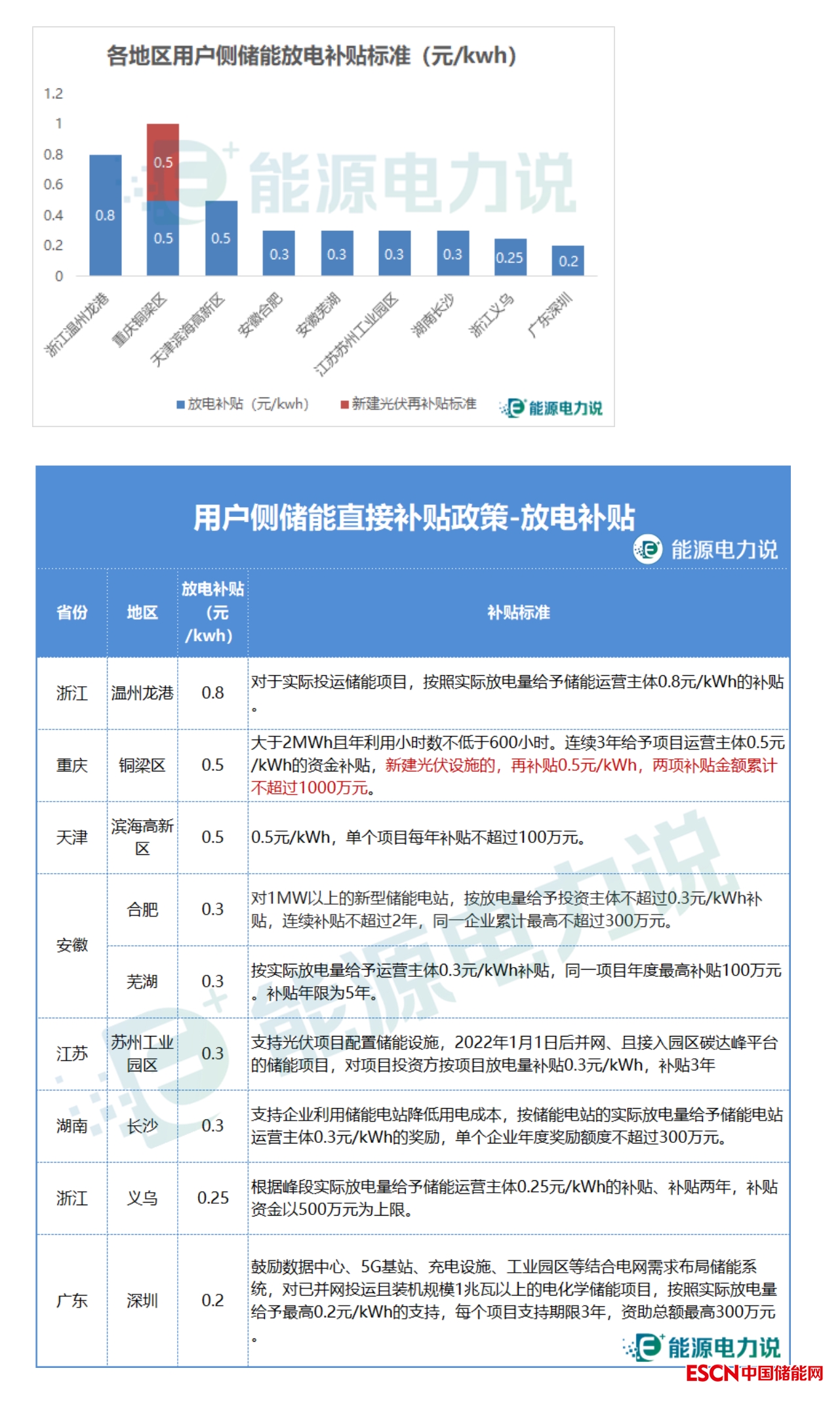 放電補貼方面,浙江溫州龍港補貼標準最高,對投運的儲能項目按照實際放電量給予儲能運營主體0.8元/kWh的補貼;重慶銅梁區(qū)在補貼方面,對大于2MWh且年利用小時數(shù)不低于600小時,連續(xù)3年給予項目運營主0.5元/kWh的補貼,新建光伏設施的,再補貼0.5元/kWh;天津濱海高新區(qū)補貼標準為0.5元/kWh。