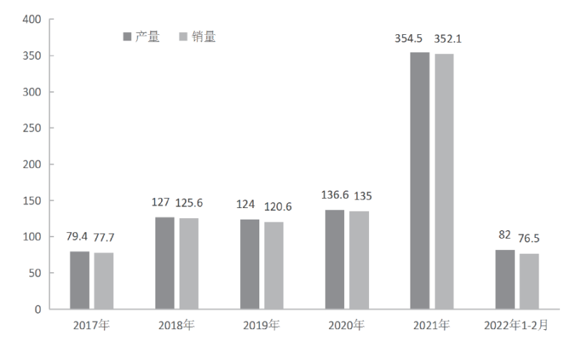 圖1 2017~2022年2月中國新能源汽車產(chǎn)銷情況(單位:萬輛)