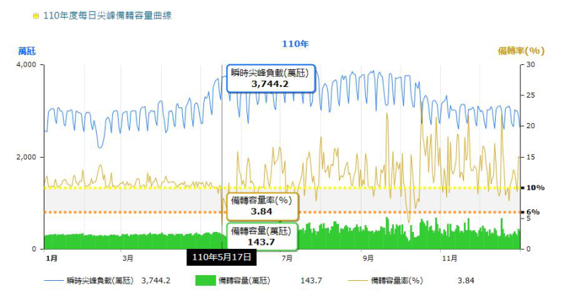 由于可再生能源的不穩(wěn)定性,加上臺(tái)灣明確在2025年前棄核,臺(tái)灣的選擇剩下煤電和氣電。但在2030年減少20%的碳排放、2050年減排50%的目標(biāo)下,臺(tái)灣電力公司建設(shè)煤電機(jī)組也被民眾投訴污染。氣電又只能依賴高價(jià)進(jìn)口的天然氣,而且臺(tái)灣本地缺乏天然氣儲(chǔ)存設(shè)施,儲(chǔ)存能力只夠7到10天的使用量。另外,臺(tái)灣的電力系統(tǒng)與外界隔絕,本質(zhì)上是一個(gè)孤島電網(wǎng)。用來(lái)衡量供電可靠性的指標(biāo)——備用容量率在2021年5月17日跌到3.84%,這個(gè)數(shù)字的推薦值為15%,低于10%存在電力短缺的風(fēng)險(xiǎn),低于7.4%則必須采取限電措施。