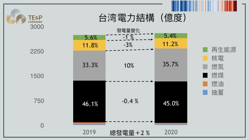 臺(tái)灣的發(fā)電結(jié)構(gòu)中,火力發(fā)電量約為2300.7億度(約占82%),燃煤占了1259.5億度,其次是燃?xì)?98.7億度,以及燃油42.4億度;核能約為314.4億度(約11%);可再生能源約151.1億度(約5%)。臺(tái)灣2020年降雨不足、水情不佳,水力發(fā)電減少46%,光伏與離岸風(fēng)電發(fā)展不如預(yù)期,導(dǎo)致可再生能源發(fā)電量與2019年相比不增反減。