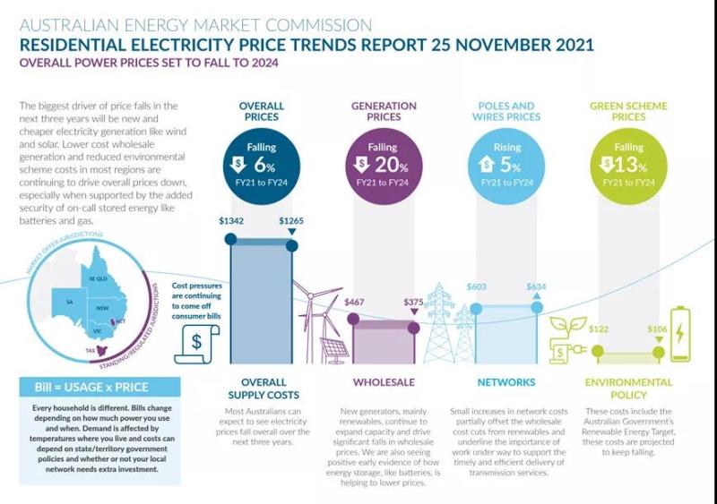 中國(guó)儲(chǔ)能網(wǎng)訊:澳大利亞能源市場(chǎng)委員會(huì)(AEMC)預(yù)計(jì),到2024年,家庭用戶用電費(fèi)用將較2021年下降約6%。其中,批發(fā)價(jià)格受可再生能源發(fā)電規(guī)模擴(kuò)大、儲(chǔ)能快速發(fā)展等因素影響,將下降約20%;與環(huán)境計(jì)劃相關(guān)的價(jià)格減少約13%;輸配電價(jià)是唯一上漲的部分,預(yù)計(jì)小幅上漲5%左右。