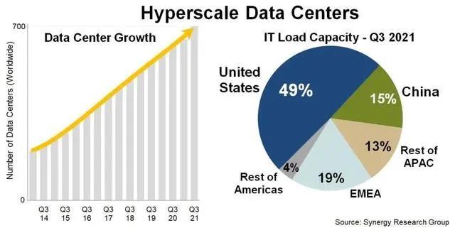 中國儲能網訊:據(jù)Synergy?Research?Group的最新數(shù)據(jù)顯示,截至2021年第三季度末,由大型供應商運營的大型數(shù)據(jù)中心數(shù)量已增至700家,而以關鍵IT負載衡量,美國占這些數(shù)據(jù)中心容量的49%,中國是繼美國之后對超大型數(shù)據(jù)中心容量貢獻第二大的國家,占總量的15%。其余的產能分布在亞太地區(qū)(13%)、EMEA地區(qū)(19%)和加拿大/拉丁美洲(4%)。