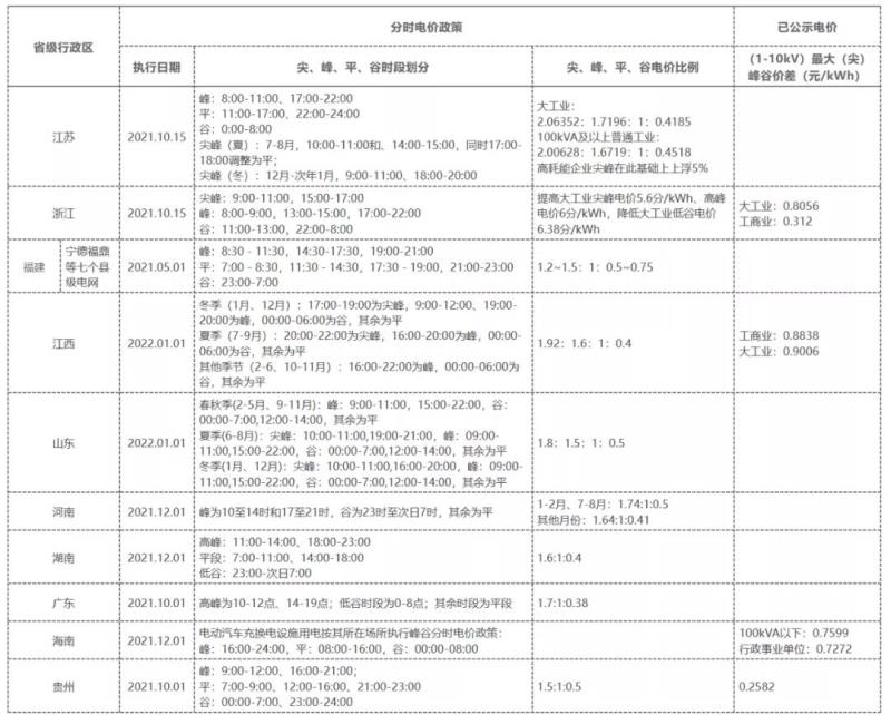 以上三個應(yīng)用場景用戶側(cè)相對來說最簡單易懂,通俗來說就是在夜間電價低時通過電網(wǎng)給儲能充電,白天電價高時通過儲能給負荷放電,賺取峰谷電價價差收益,因此以往的用戶側(cè)儲能項目主要集中在北京、江蘇、廣東等峰谷價差較高地區(qū)。自今年7月份國家發(fā)展改革委發(fā)布《關(guān)于進一步完善分時電價機制的通知》以來,全國已有多個省份陸續(xù)出臺相應(yīng)政策文件,峰谷價差不斷拉大,部分省份的價差已經(jīng)超過1元/kWh,且隨著儲能系統(tǒng)度電成本的不斷降低,儲能在用戶側(cè)的大規(guī)模應(yīng)用指日可待。