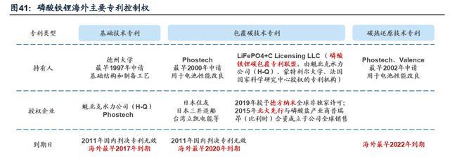 海外磷酸鐵鋰核心專利保護(hù)期結(jié)束為中國(guó)企業(yè)出海鋪路。我國(guó)鋰電產(chǎn)業(yè)起步相 對(duì)較晚,電池材料專利布局落后于歐美、日韓企業(yè),而磷酸鐵鋰的基礎(chǔ)結(jié)構(gòu)、碳包 覆、碳還原三大核心技術(shù)分別在1997年、2000年和2002年分別被德州大學(xué)諾貝爾獎(jiǎng) Goodenough教授團(tuán)隊(duì)、加拿大魁北克水力公司和英國(guó)Valence公司申請(qǐng),雖然國(guó)內(nèi) 于2011年判定磷酸鐵鋰制造技術(shù)專利無(wú)效,但仍制約國(guó)內(nèi)磷酸鐵鋰電池企業(yè)出海。 根據(jù)各國(guó)專利法相關(guān)規(guī)定,發(fā)明型專利保護(hù)期在10-20年,2017年隨著磷酸鐵鋰基 礎(chǔ)結(jié)構(gòu)的專利保護(hù)到期,國(guó)內(nèi)企業(yè)海外磷酸鐵鋰布局加快,而2022年隨著海外碳熱 還原技術(shù)專利保護(hù)期的結(jié)束,將為中國(guó)磷酸鐵鋰電池企業(yè)出海鋪路。