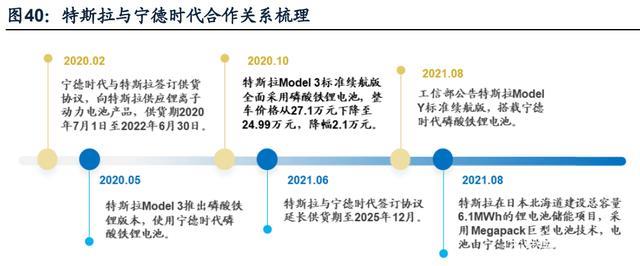 合作寧德時(shí)代,磷酸鐵鋰全球化趨勢(shì)顯現(xiàn)。2020年2月,寧德時(shí)代公告與特斯 拉簽訂為期兩年的供貨協(xié)議,向其供應(yīng)鋰動(dòng)力電池,作為特斯拉目前磷酸鐵鋰電池 唯一供應(yīng)商,寧德時(shí)代助力特斯拉推出磷酸鐵鋰版Model 3和Model Y,進(jìn)一步下探 整車成本提升競(jìng)爭(zhēng)力,中國(guó)產(chǎn)業(yè)鏈完善帶來(lái)的成本優(yōu)勢(shì)凸顯。2021年6月,寧德時(shí) 代宣布與特斯拉供貨協(xié)議延長(zhǎng)至2025年底,隨著寧德時(shí)代德國(guó)工廠的投運(yùn),磷酸鐵 鋰電池有望進(jìn)一步擴(kuò)大全球份額,提升市場(chǎng)認(rèn)可度。2021年10月,特斯拉宣布將全 球范圍內(nèi)將所有標(biāo)準(zhǔn)續(xù)航版電動(dòng)車都改用磷酸鐵鋰電池,磷酸鐵鋰全球化趨勢(shì)凸顯; 儲(chǔ)能業(yè)務(wù)方面,特斯拉與日本電力公司Global Engineering合作的6.1GWh鋰電池儲(chǔ)能項(xiàng)目將采用特斯拉Megapack巨型電池技術(shù),電芯由寧德時(shí)代供應(yīng),根據(jù)馬斯克表 述,未來(lái)特斯拉儲(chǔ)能系統(tǒng)有望全部采用磷酸鐵鋰電池,重塑價(jià)格與安全性優(yōu)勢(shì)。(報(bào)告來(lái)源:未來(lái)智庫(kù))