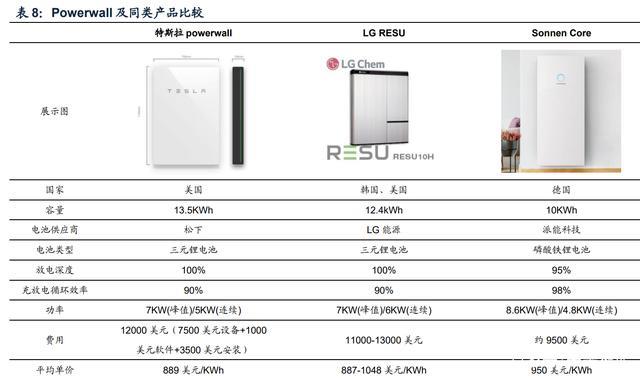Powerwall 打開(kāi)家庭儲(chǔ)能需求。2015 年 5 月,特斯拉首次推出 Powerwall 產(chǎn) 品,主打家庭儲(chǔ)能以存儲(chǔ)戶用光伏電量,7/10KWh 產(chǎn)品分別售價(jià) 3000/3500 美元; 2016 年 10 月,特斯拉發(fā)布二代 Powerwall 家用儲(chǔ)能設(shè)備,電芯采用與松下合作的 三元鋰電池,容量提升至 13.5KWh,此后由于需求高增特斯拉連續(xù)上調(diào)價(jià)格至 7500 美元并開(kāi)啟與 Solar Roof 捆綁銷售模式。Powerwall 主要目的在于幫助家庭實(shí)現(xiàn)清 潔能源充電、增強(qiáng)系統(tǒng)用電獨(dú)立性,為用戶提供全方位能源供應(yīng)。此外用戶可以通 過(guò)特斯拉應(yīng)用程序,對(duì)發(fā)用電情況進(jìn)行實(shí)時(shí)監(jiān)測(cè),以滿足家庭特定用能需求。與同 類主流產(chǎn)品 LG RESU 和 Sonnen Core 對(duì)比,特斯拉 Powerwall 兼具美觀與經(jīng)濟(jì)屬 性,未來(lái)隨著磷酸鐵鋰電池海外市場(chǎng)認(rèn)可度的逐步提升,磷酸鐵鋰電池有望大規(guī)模 應(yīng)用于海外儲(chǔ)能領(lǐng)域,進(jìn)一步下探產(chǎn)品價(jià)格。