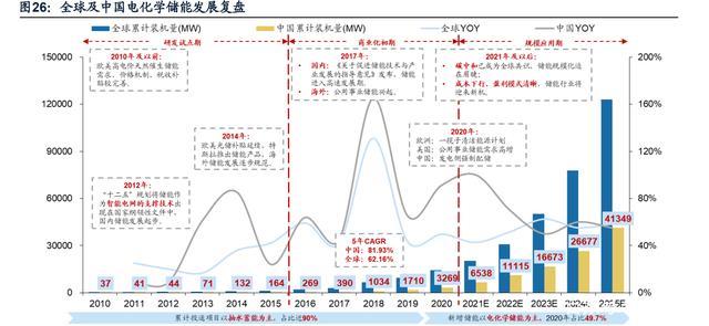 電化學(xué)儲(chǔ)能從周期性向成長(zhǎng)性過(guò)渡,2021年步入快速增長(zhǎng)期。2010年起隨著海 外光伏發(fā)展起步,儲(chǔ)能配套步入試點(diǎn)期;2014年歐美光儲(chǔ)補(bǔ)貼延續(xù)刺激新一輪儲(chǔ)能 需求;2017年起隨著海外公用事業(yè)儲(chǔ)能項(xiàng)目需求提升,國(guó)內(nèi)通過(guò)出臺(tái)《關(guān)于促進(jìn)儲(chǔ) 能技術(shù)與產(chǎn)業(yè)發(fā)展的指導(dǎo)意見(jiàn)》與電力體制改革市場(chǎng)化推進(jìn),全球及中國(guó)儲(chǔ)能裝機(jī) 實(shí)現(xiàn)快速增長(zhǎng),第二輪景氣周期到來(lái)。2020年起隨著一系列政策的密集出臺(tái)與全球 碳中和目標(biāo)的高導(dǎo)向性,“儲(chǔ)能+”模式在多個(gè)應(yīng)用場(chǎng)景實(shí)現(xiàn)規(guī)模擴(kuò)張,行業(yè)空間打 開(kāi)。截至2020年底,全球累計(jì)電化學(xué)儲(chǔ)能規(guī)模達(dá)14.2GW,同比增長(zhǎng)49.6%%,其中 2020年新增4.7GW,同比增長(zhǎng)63.8%%,大型項(xiàng)目助推儲(chǔ)能高速發(fā)展。