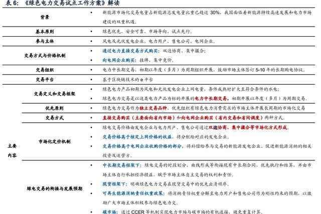 綠電交易凸顯清潔能源環(huán)境價(jià)值,風(fēng)光配儲(chǔ)價(jià)值進(jìn)一步凸顯。在積極推動(dòng)新一 輪電力體制改革的大背景下,新能源市場(chǎng)化交易電量占新能源總發(fā)電量比重已趨近 30%,新能源持續(xù)高速發(fā)展和電力市場(chǎng)建設(shè)為新型電力系統(tǒng)帶來(lái)雙重機(jī)遇。2021年 9月7日,國(guó)家發(fā)改委正式批復(fù)《綠色電力交易試點(diǎn)工作方案》,從交易框架、優(yōu)先 原則、交易方式、定價(jià)機(jī)制和發(fā)展預(yù)期五方面明確綠電交易的發(fā)展規(guī)劃,強(qiáng)化綠電 的綠色屬性和環(huán)境價(jià)值,通知印發(fā)后的首個(gè)交易日,首批綠電交易價(jià)格較當(dāng)?shù)仉娏?中長(zhǎng)期交易價(jià)格溢價(jià)0.03-0.05元/千瓦時(shí),溢價(jià)率約10%,綠電的高環(huán)境價(jià)值加速刺 激風(fēng)光儲(chǔ)一體化發(fā)展。