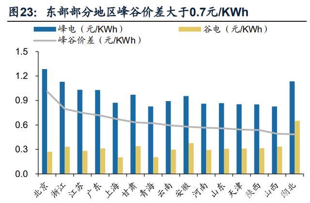 用戶側(cè)儲(chǔ)能需求激活,工商業(yè)配儲(chǔ)潛力打開(kāi)。用戶側(cè)儲(chǔ)能主要目的在于分時(shí)電 價(jià)管理和兩部制電價(jià)下的容量電費(fèi)管理,據(jù)我們測(cè)算在1.5元/Wh的儲(chǔ)能系統(tǒng)成本下, 峰谷價(jià)差大于0.7元/KWh可實(shí)現(xiàn)超10%的內(nèi)部收益率,配儲(chǔ)降本優(yōu)勢(shì)顯著。目前僅 北京、浙江、江蘇、廣東等東部主要省份工商業(yè)峰谷價(jià)差高于0.7元/KWh,政策明 確擴(kuò)大峰谷價(jià)差將進(jìn)一步驅(qū)動(dòng)工商業(yè)配儲(chǔ)。未來(lái)伴隨峰谷價(jià)差進(jìn)一步擴(kuò)大、浮動(dòng)電 價(jià)制度推進(jìn)疊加儲(chǔ)能持續(xù)降本,儲(chǔ)能的“投資品”屬性愈發(fā)凸顯。