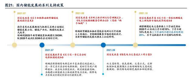 政策加碼強(qiáng)化國(guó)內(nèi)儲(chǔ)能放量,發(fā)展規(guī)劃、市場(chǎng)地位和經(jīng)濟(jì)性全面提升儲(chǔ)能發(fā)展 空間。2021年以來(lái),國(guó)家發(fā)改委分別從儲(chǔ)能發(fā)展規(guī)劃、儲(chǔ)能市場(chǎng)主體地位、儲(chǔ)能的 經(jīng)濟(jì)性等方面相繼發(fā)布一系列頂層設(shè)計(jì)政策支持儲(chǔ)能全面發(fā)展,包括《關(guān)于加快推 動(dòng)新型儲(chǔ)能發(fā)展的指導(dǎo)意見(jiàn)》明確到2025年國(guó)內(nèi)電化學(xué)儲(chǔ)能裝機(jī)規(guī)模達(dá)30GW,新 版“兩個(gè)細(xì)則”明確儲(chǔ)能參與電力市場(chǎng)與火電等機(jī)組同等的市場(chǎng)地位,《關(guān)于進(jìn)一 步完善分時(shí)電價(jià)機(jī)制的通知》進(jìn)一步擴(kuò)大峰谷價(jià)差、《綠色電力交易試點(diǎn)工作方案》 突出新能源電力的綠色屬性和環(huán)境價(jià)值、《關(guān)于進(jìn)一步深化燃煤發(fā)電上網(wǎng)電價(jià)市場(chǎng) 化改革的通知》擴(kuò)大煤電上浮幅度,多因素共振打開(kāi)儲(chǔ)能需求空間,儲(chǔ)能發(fā)展的制 度制約和經(jīng)濟(jì)性制約正逐步消除。