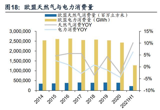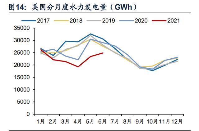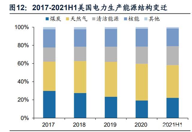 水電、風(fēng)電具備明顯的季節(jié)特性,歐美異常氣候?qū)е绿烊粴馓娲枨笤鲩L(zhǎng)與電 力缺口產(chǎn)生。歐洲方面,2021 年以來(lái)長(zhǎng)時(shí)間超高壓氣候?qū)е潞I巷L(fēng)速下降,風(fēng)力 發(fā)電量隨之下降,作為歐洲傳統(tǒng)的風(fēng)力發(fā)電旺季,在 2020 年風(fēng)電裝機(jī)新增14.7GW, 裝機(jī)規(guī)模增長(zhǎng) 7.87%的條件下,2021H1 歐洲風(fēng)力發(fā)電量同比下降 7.47%。而美國(guó) 則受極端干旱天氣影響,2-6 月月度水力發(fā)電量均低于過(guò)去四年同期水平,2021H1 水力發(fā)電量同比下降12.59%,水電占比從2020年7.26%下降至2021H1的6.95%。 水電、風(fēng)電的不足致使歐美電力市場(chǎng)的天然氣替代需求提升,而天然氣供給短缺又 進(jìn)一步拉大電力缺口。