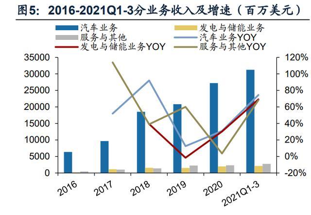 發(fā)電與儲(chǔ)能業(yè)務(wù)發(fā)展迅速,2015-2020年復(fù)合增速82.09%。2016年收購(gòu) SolarCity后特斯拉發(fā)電與儲(chǔ)能業(yè)務(wù)規(guī)模迅速擴(kuò)大,單項(xiàng)業(yè)務(wù)收入從2016年的1.81億 美元提升到2020年19.94億美元,四年復(fù)合增速82.09%;營(yíng)收占比從2016年的2.59% 提升至2020年6.32%,發(fā)電與儲(chǔ)能業(yè)務(wù)在特斯拉業(yè)務(wù)體系中的重要性逐步提升。 益于家庭儲(chǔ)能需求高增及全球碳中和下儲(chǔ)能支持政策的加速出臺(tái),2021年Q1-3公司 發(fā)電與儲(chǔ)能業(yè)務(wù)營(yíng)收21.01億美元,同比提升69.16%。同時(shí)隨著光儲(chǔ)成本的持續(xù)下 降,消費(fèi)者購(gòu)買而非租賃設(shè)備的意愿逐步增強(qiáng),分業(yè)務(wù)看,2021年Q3公司發(fā)電與儲(chǔ) 能設(shè)備銷售收入6.62億美元,同比提升50.80%環(huán)比提升1.38%,租賃收入僅1.44億 元,同比提升2.86%環(huán)比下降2.70%,設(shè)備銷售收入占比持續(xù)提升。
