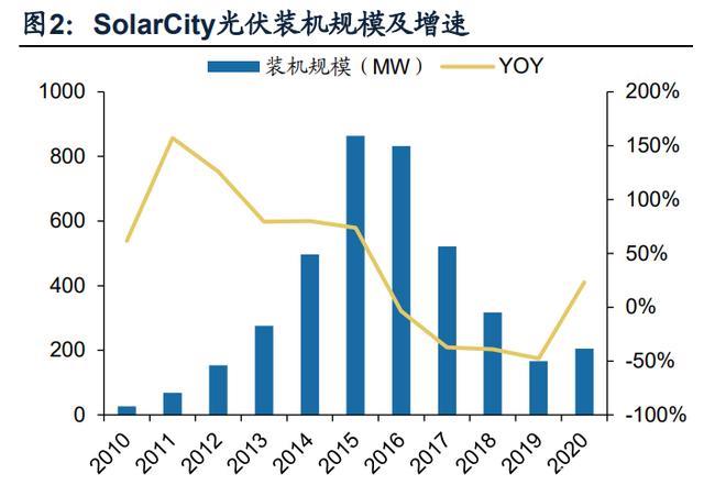 收購(gòu) SolarCity 切入屋頂光伏領(lǐng)域。2006 年馬斯克參與創(chuàng)立 SolarCity,公司 定位于城市與住宅聚集區(qū)光伏發(fā)電開(kāi)發(fā),除普通購(gòu)買模式外,SolarCity 創(chuàng)新性地提 供購(gòu)電協(xié)議(PPA)和租賃模式,通過(guò)將屋頂光伏發(fā)電系統(tǒng)租賃給客戶收取租金或 與用戶簽訂售電協(xié)議收取電費(fèi)。受益于美國(guó)的投資稅抵免和成本加速折舊等稅收優(yōu) 惠政策,SolarCity 光伏裝機(jī)規(guī)模發(fā)展迅猛,2012 年在加州居民與商業(yè)屋頂發(fā)電項(xiàng) 目占據(jù) 15%市場(chǎng)份額,2010-2015 年復(fù)合增速達(dá) 101%,由于公司經(jīng)營(yíng)模式需預(yù)先 支付安裝太陽(yáng)能電池板費(fèi)用,前期投入成本較大,光伏項(xiàng)目回收期較長(zhǎng),債務(wù)高筑 拖累公司業(yè)務(wù)發(fā)展,其后裝機(jī)規(guī)模逐年遞減。2016 年特斯拉斥資 26 億美元收購(gòu) SolarCity,正式切入屋頂光伏領(lǐng)域。