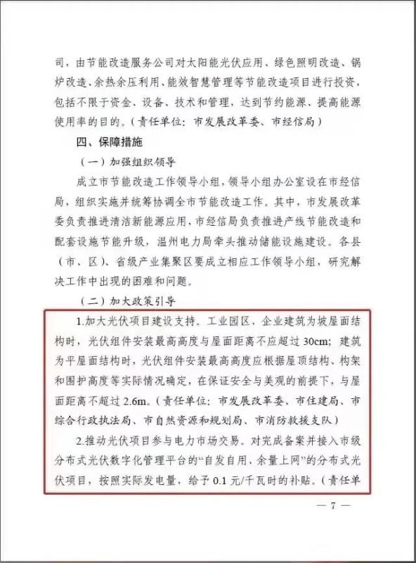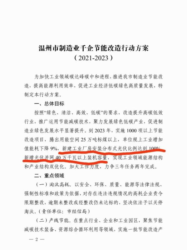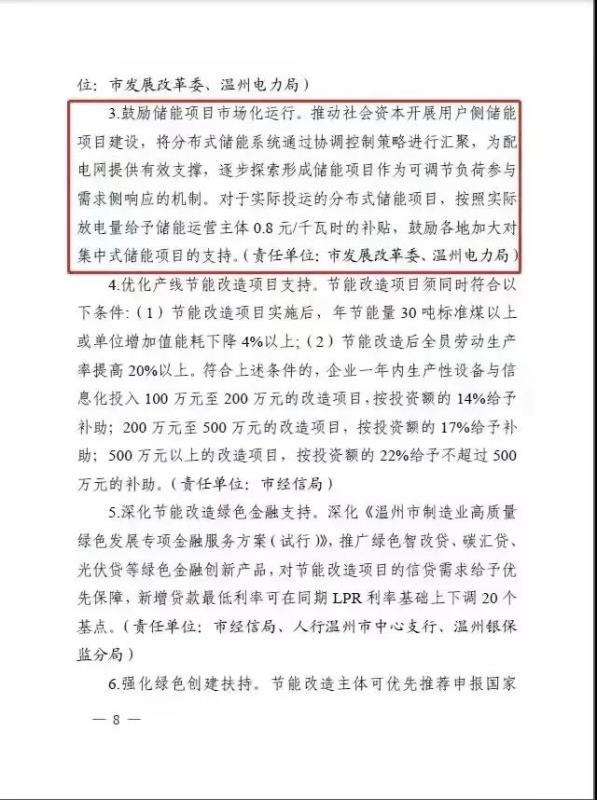 10月25日,溫州市人民政府辦公室發(fā)布《溫州市制造業(yè)千企節(jié)能改造行動方案(2021-2023)》,方案指出,新建工業(yè)廠房安裝分布式光伏比例達(dá)到100%以上。推動社會資本開展用戶側(cè)儲能項(xiàng)目建設(shè),將對于實(shí)際投運(yùn)的分布式儲能項(xiàng)目,按照實(shí)際放電量給予儲能運(yùn)營主體0.8元/千瓦時的補(bǔ)貼,鼓勵各地加大對集中式儲能項(xiàng)目的支持。