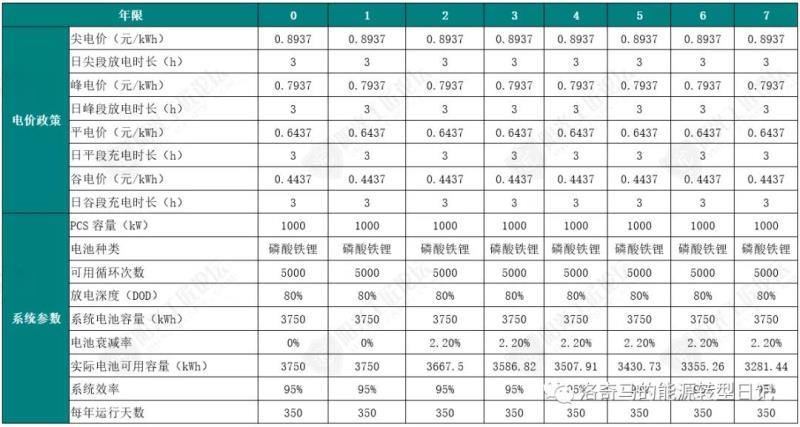 假設(shè)用戶側(cè)儲(chǔ)能項(xiàng)目系統(tǒng)功率1MW,每天充放電各3小時(shí),每天循環(huán)兩次,放電深度80%,電池循環(huán)次數(shù)約5000次,每年有效運(yùn)行天數(shù)為350天,則總裝機(jī)容量為(1MW×3/80%=)3.75MWh,經(jīng)營(yíng)期(5000/(350×2)≈7)7年。