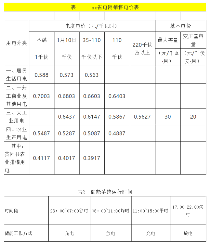 根據(jù)xx省現(xiàn)行電網(wǎng)銷售電價(jià)表(見表一)和峰谷時(shí)間電價(jià)表,本項(xiàng)目可采用峰尖時(shí)刻放電,谷平時(shí)刻充電的方式賺取峰谷電價(jià)差。