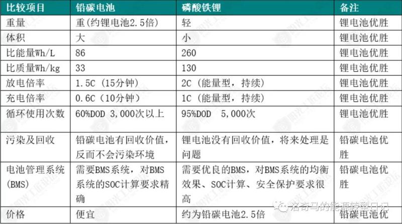 儲(chǔ)能是通過(guò)物理或化學(xué)手段將電、熱等形式的能量?jī)?chǔ)存起來(lái),在出現(xiàn)用能需求時(shí)釋放的過(guò)程。目前化學(xué)儲(chǔ)能技術(shù)主要包括鉛酸電池、鉛炭電池、氧化還原液流電池、鈉硫電池、鐵鋰電池。表3.2-1是鉛碳電池與鋰電池比較情況: